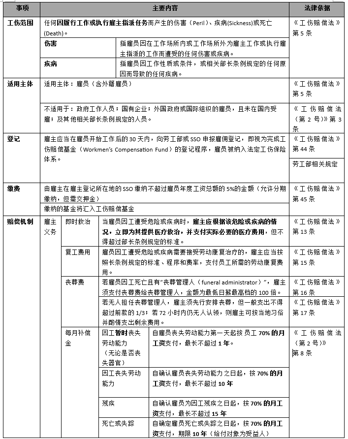 雇主对在工作中受伤、职业病或死亡的员工负直接赔偿责任(包括医疗费、生活补助、丧葬费等),并有专门基金或管理与追偿机制。